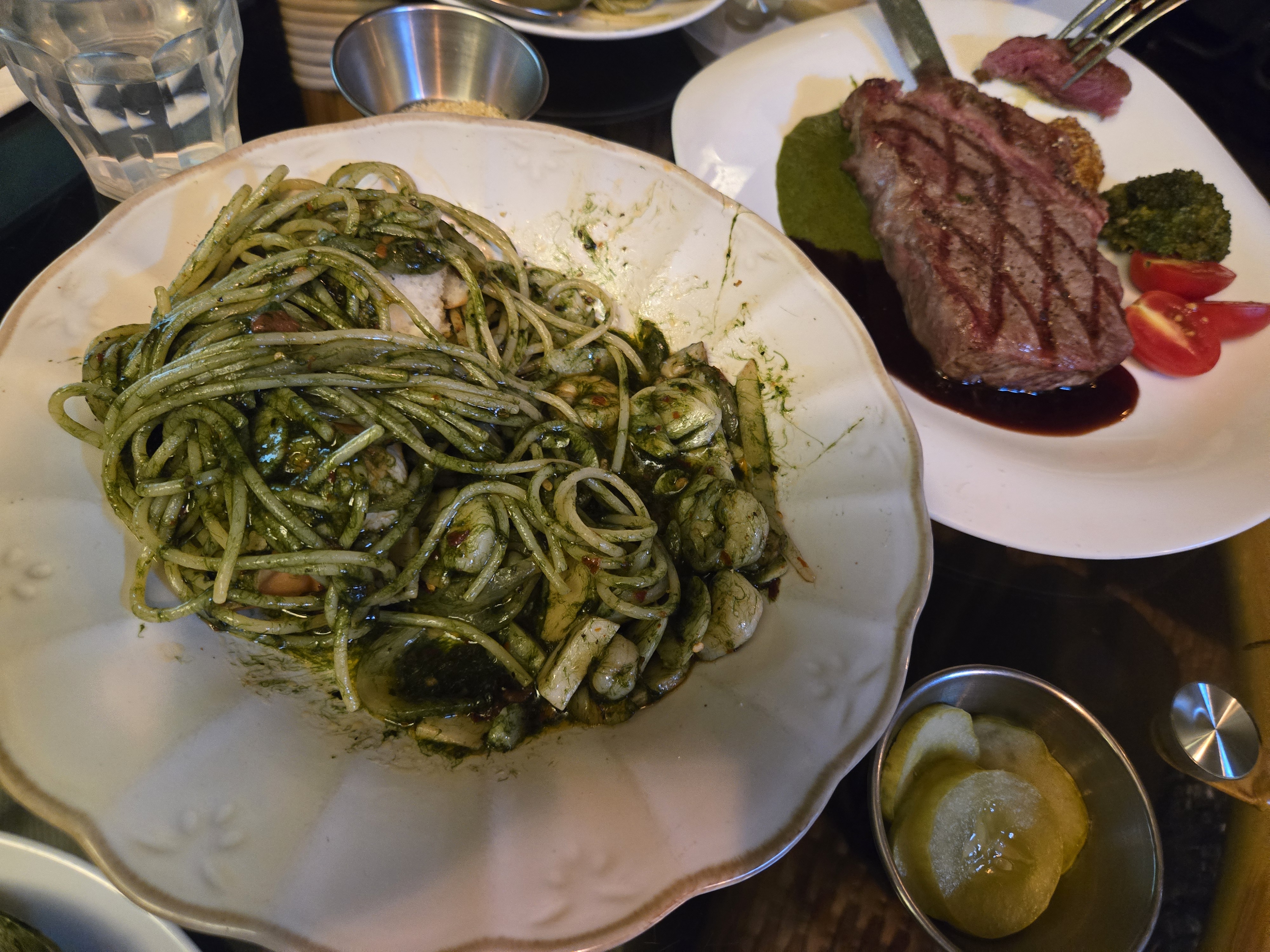 매생이파스타는 간이 안 세서 좋았고, 채끝살스테이크도 실하고 곁들여나온 스테이크소스(특히 페스토 소스!)도 맛있었다. 성인 2명이 먹기 딱 좋은 양이었다.