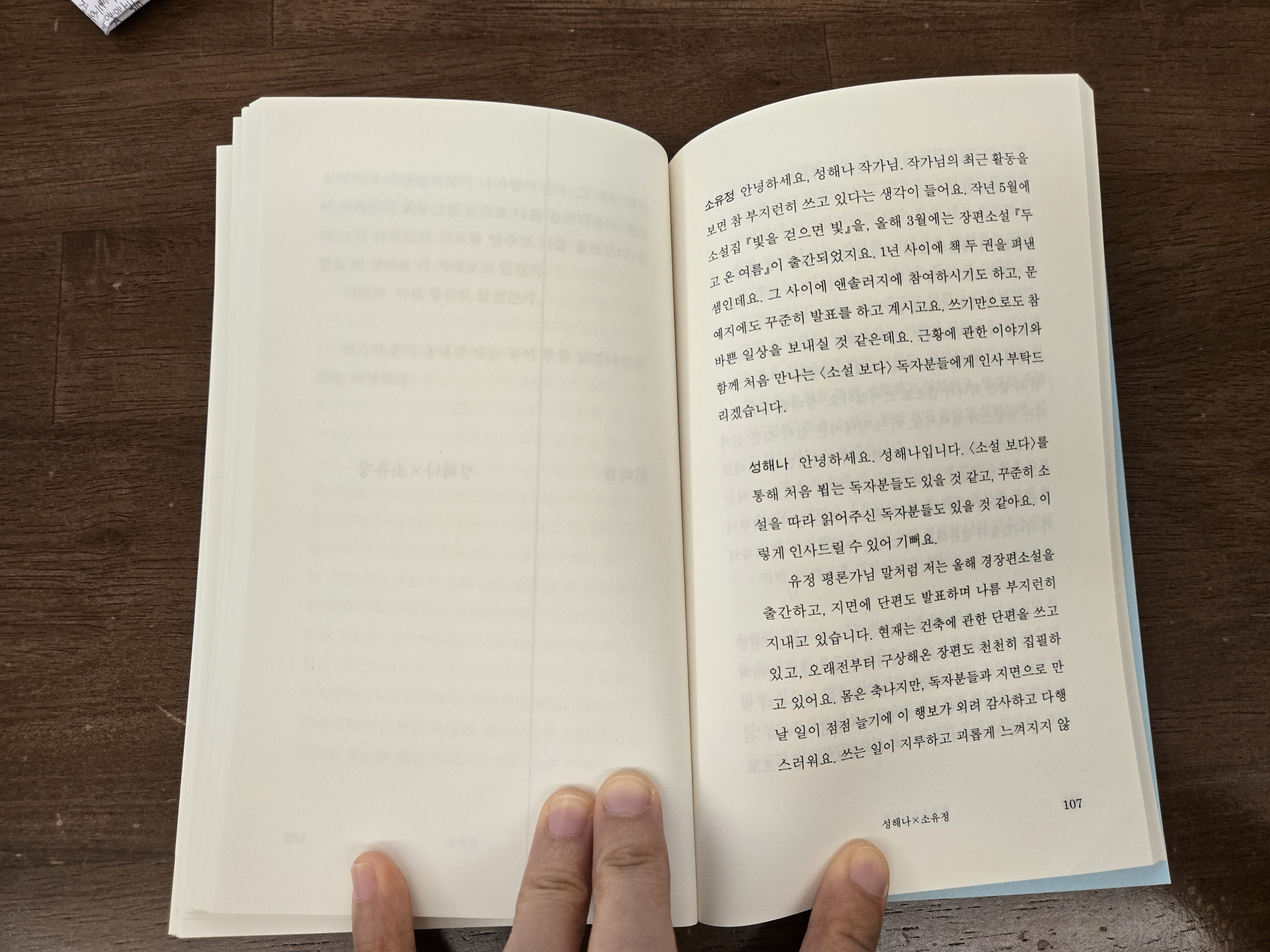 '소설 보다' 시리즈의 또다른 매력은 작품마다 실려 있는 작가와의 대담문이었다. 물론 몇페이지 남짓한 질답으로 모든 궁금증이 해소되는건 아니었지만 연계되는 다른 작품을 알게 되고 작가의 당시 근황과 사상을 엿볼 수 있다는 점에서 메리트가 꽤 컸다. 단편집을 안 좋아하는 주변 지인들이 더러 있는데, 구체적인 이유는 알지 못하나 짧은 분량으로 인해 스스로를 제대로 설명하지 못하는 단편소설의 구조적 한계 때문이 아닌가 생각된다. 하지만 이렇게 작품 뒤에 대담문이 실린다면...? 더 많은 사람들이 단편집을 좋아하게 되지 않을까.